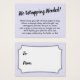 Wenn Sie eine Dusche ohne Geschenkverpackung für eine zukünftige Braut beherbergen, könnte diese lustige, einfache Karte die Wahl für Sie sein. Mit einem eleganten Skript-Schriftart fügte ich zuerst einen Header hinzu, der auf der Vorderseite "No Wrapping Needed!" und auf der Seite "To" und "From" für die Geschenkmarke steht. Das Vorlagenfeld war Set, um den Gästen Anweisungen zu geben, die ihr Geschenk nicht einpacken; bitte ändern Sie den Wortlaut nach Belieben. Es gibt viele beliebte Alternativen zu diesem Text, wenn Sie möchten, eine Änderung. Alle Schriftart und Farben können nach Belieben modifiziert werden.