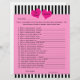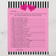 Dieses lustige Brigade- oder Polterabend-Spiel macht eine großartige Ergänzung zu einem Brigade oder Polterabend. Das Design ist mit schwarz-weißen Streifen als Kulisse mit zwei rosa Herzen an der Spitze gestaltet. Ein Herz sagt "Wer weiß" und das andere Herz sagt den Namen der Braut (die Sie anpassen können) auf dem Design. Es gibt einen Ort für den Namen des Party Gast, Spielanleitungen und 20 Fragen über die Braut. Die Idee ist, zu sehen, wer die Braut am besten kennt mit der Person, die die meisten Punkte gewinnt das Spiel. Das Tolle an diesem Brautparty ist, dass Sie es mit dem Namen der Braut anpassen können und Sie es mit der Farbe der Braut als Hintergrund für die Fragen anpassen können...um dies zu tun, klicken Sie einfach auf Bearbeiten und wählen Sie eine Hintergrundfarbe. Dieses Brautparty-Spieldesign wird auf Leinenpapier vorgestellt, um einen schönen Look für ein Brautparty zu schaffen, kommt aber auch in anderen Papieren. Eine unterhaltsame und einmalige Ergänzung zu Ihrem Brautparty. Copyright henishouseuse paper