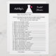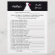 Dieses lustige Bridal- oder Polterabend-Spiel ist die perfekte Wahl für ein Brautparty. Mit einem Brautkleid auf schwarzem Hintergrund mit rosa Rosen auf der Oberseite des Designs, kann das Design für Ihre Braut personalisiert werden, mit ihrem Namen zum links Brautkleid und den Worten "Brautparty" rechts vom Brautkleid. Dieses Spiel beinhaltet 20 Fragen, die Brautgäste oder Polterabend über die Braut beantworten können. Es gibt einen Punkt am unteren Ende, um die Gesamtpunktzahl zu addieren und Sie haben es erraten...Die Person mit den meisten Punkten gewinnt das Spiel. Das Design ist auf einem hübschen weißem Leinenpapier gehalten, um ein Brautparty perfekt zu ergänzen. Ein lustiges und großartiges Brigade- oder Polterabend-Spiel. Copyright henishouseuse paper