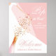 This bridal shower welcome poster features a sparkling wine bottle spraying gold faux sequins and a bride in her dress and veil holding a glass flute against a blush pink background and your details in chic lettering. Order printed or as an INSTANT DOWNLOAD to have it printed locally. MATCHING items in our collection.