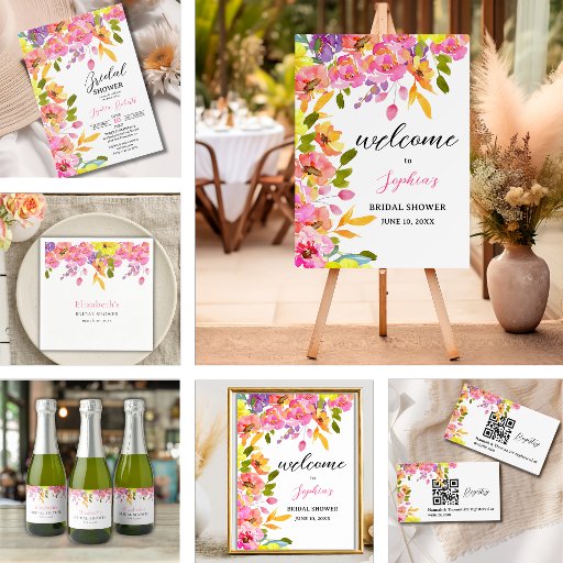 Lindo diseño de ducha de novia para primavera o verano con lindo arreglo floral en acuarela con colores amarillo y rosa dandole un toque elegante y casual a tu ducha de novia. el diseño tiene un fondo rosa en la parte de atras y un estilo de tipografia elegante en la parte frontal. Este lindo diseño floral de ducha de novia se puede usar para tu fiesta de primavera o verano. Para productos complementarios favor de consultar la coleccion de este lindo diseño.