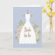 This is a Bridal Shower card with a beautiful white wedding dress on a hanger with flowers behind and around it. The text says ‘Bride to be.’