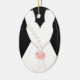 Ein wunderschönes weißes Hochzeitskleid, das von sanften rosa Blume und einem rosa Rosenstrauß vor dem Kleid betont wird.
