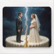 A bride and groom stand on a giant wedding cake, separated by a dramatic crack and a bolt of lightning, creating a feeling of tension.