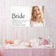 Personalisieren Sie mit der Definition und dem Foto der Braut, um ein einzigartiges Geschenk für Brautpartys, Bachelorette oder Hennen Party und Hochzeiten zu schaffen. Ein perfekter Weg, ihr zu zeigen, wie phantastisch sie an ihrem großen Tag ist und ein perfekter Sake für die Erholung ihres Lebens. Entwickelt von Thisisnotme©