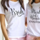 Stilvolles Bride Shirt in einem schicken schwarzen Skript enthält auf der Rückseite den eigenen Text "Future Mrs. LASTNAME". Ein großartiges Brautparty-, Junggeselinnen-Abschied- oder Hochzeitsgeschenk für die Braut-zu-be! Laden Sie unser Geschäft für das passende Groom Shirt ein.