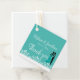 Aquamarin blaugrüne Hochzeitsgeschenkmarke für Ihren besonderen Tag mit weißen Wirbel und Braut- und Bräutigbildern von PLdesign. Sie können Text, Bilder und blau-grün aquamarine Farbe anpassen. Personalisieren Sie Gastgeschenk Hochzeit mit Bräutigam Braunamen und Hochzeitstag.