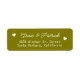 Ihre Zuhause-Adresse ist leicht personalisiert... Oliven-Farblabel mit zwei Textzeilen, die zentriert ausgerichtet sind, und Braut- und Bräutigam-Namen, die in einem stilvollen Schriftart geschrieben sind, mit dem Bild von zwei kleinen weißen Herzen der Liebe.