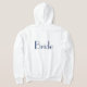 Bride Front Zip Hoodie wird in Weiß mit einem Bride Text in der Farbe Navy auf der Vorder- und Rückseite gezeigt. Passen Sie dieses Objekt an oder kaufen Sie, wie es ist.