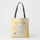 Gelber, weißer Hintergrund mit Wabenmuster. Blume, Hibiskus und Hummeln sind mit hellgelben, cremefarbenen tropischen Blumen geschmückt. Vorlage für den Namen der Braut. Grüner handgeschriebener Text: Bride to Bee.