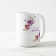 Diese Tasse ist ein wunderschönes Brautgeschenk und zeichnet sich durch ein hübsches lila Blumenwasser-Farbdesign aus. Ihr Name ist in lila Schriftart in der Mitte geschrieben. Unter ist "Bridesmaid" auch in lila geschrieben, aber kursiv. Personalisieren Sie Ihre noch heute!