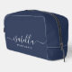 Diese Bridesmaid-Accessoires-Tasche enthält eine handgeschriebene weiße Skripttypografie mit Swashes auf Mitternacht oder marineblau Hintergrund. Präsentieren Sie Ihre Brautjungfrauen mit einer Toilettentasche für ihr Schminken und kleinen Gegenständen, die traditionell am Probe-Dinner präsentiert werden, für den Einsatz am frühen Morgen vor der Hochzeit.