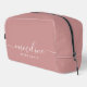 Diese Bridesmaid-Accessoires-Tasche enthält eine handgeschriebene weiße Skripttypografie mit Schlaganfällen auf einem staubigen rosa Hintergrund. Präsentieren Sie Ihre Brautjungfrauen mit einer Toilettentasche für ihr Schminken und kleinen Gegenständen, die traditionell am Probe-Dinner präsentiert werden, für den Einsatz am frühen Morgen vor der Hochzeit.