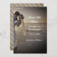 Der Nebel-Filter gibt mit dieser Hochzeitscoupe, Bride und Groom auf Sunset Beach Save the Date Flat Card einen Spotlight und Grauauseffekt ab. Sie können dies für Ihr Foto ändern oder das wunderschöne Foto in dieser Vorlage behalten. Auf der Rückseite der Karte befindet sich ein grau gestreiftes diagonales Muster, das einigen der Farben des Sandes entspricht.