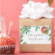 Sommerorchard mit schönen Früchten, ein rustikales Bauernhaus mit überhängenden Ästen voller Früchte. Das ist ein lustiges sommerliches Aquarell-Design mit Pfirsichen, Orangen, Blütenfarben, ergänzt durch Grün und zarte Blume Blüten.