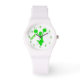 Stilvolle Cheerleader-Armbanduhr mit der hellgrünen Silhouette eines Springhirten vor weißem Hintergrund. Grüne Zahlen und Punkte, die die Stunden darstellen, und ein benutzerdefinierter grüner Text, der mit dem Namen Ihres Lieblings-Cheerleader personalisiert werden kann. Macht eine tolle Geschenkidee.