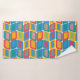 Dieses Handtuchhandtuch ist mit einem hellrosa Waschtuch, einem gelben Handtuch und einem Badehandtuch mit einem modernen, hellen Design aus der Mitte des Jahrhunderts, das abgerundete Rechtecke mit anderen Rechtecken innerhalb von einer Kollektion von Linien bildet.