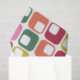A sleek modern geometric print in retro 1970s colors of red, green, orange, pink and lime green on white is the perfect way of adding some vintage style to your holiday gifts this year.