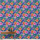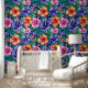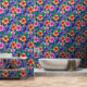 A bold, maximalist tropical floral print with big purple, orange, and pink blooms on a dark blue background,