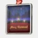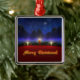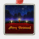 Eine 3D-Weihnachtsszene in Vue, mit Kerzen Set auf Rot vor Kieferngarten mit Rot-und Goldverzierungen. Im schneebedeckten Hintergrund stehen blau-grüne Tannenbäume vor einem strahlenden Sternenhimmel aus Fraktal. Ein funkelnder Single dominiert den Nachthimmel. Vor den Ferien Dekorationen ist ein leuchtendes Gold Frohe Weihnachtsgrüße.