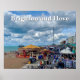 Brighton Beach ist sehr lebhaft, mit den berühmten Überresten des West Pier in der Ferne und einem lebhaften Karussell mit rotem und gelbem Kronen im Vordergrund. Die Promenade ist belebt und der Himmel ist mit flauschigen Wolken und einem hellblauen Hintergrund übersät.