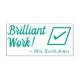 Dieses ermutigende Design der Gummi Briefmarke beinhaltet die positive Rückmeldung "Brilliant Work!" und den Namen eines personalisierten Lehrers. Es verfügt auch über ein dekoratives Auswahlfeld. Es könnte von einem Lehrer oder Erzieher verwendet werden, wenn sie die Aufgaben markieren, um anzuerkennen, dass der Schüler eine großartige Arbeit geleistet hat.