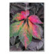 Ein leuchtend farbiges Fallblatt in den Farben Magenta, Rot, Orange, Gelb, Gold und Grün hebt sich vor einem Hintergrund von grauen und braunen Herbstreben und Gras hervor.