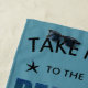 Nehmen Sie mich zum Strandhandtuch - Auf blauem Hintergrund mit Seestern und dekorativem Text dekoriert: "Bring mich zum Strand"