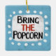 "Bringen Sie den Popcorn" ist ein niedliches Textdesign in hellblau mit schwarzem und rotem Text, mit einer weißen Akzent-Form und weißen texturierten weißen, weißlichen, weißlichen, weißlichen Punkten, die ihn umgeben.