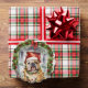 Eine Weihnachtsschmuckkarte mit Britischem Bulldog in einer Weihnachtsmannmütze und einem Urlaubslicht, stand vor einer weihnachtlich dekorierten Haustür. Britische Bulldogard-Dekorationskarten, eine einzigartige Alternative zu einer traditionellen Ricaso-Karte - fügen Sie Ihren eigenen Text hinzu