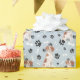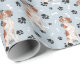 Ein Bild eines rot-weißen Bretagne-Hundes ist das Merkmal dieses jeden Anlasses Geschenkpapier. Der Hund sitzt inmitten eines Musters aus schwarzen Pfoten und weißen Knochen und wird auf einem silberblauen Hintergrund wiederholt.