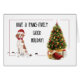 Eine gut aussehende brüchige Hunderasse sitzt neben einem geschmückten Weihnachtsbaum. Pakete warten auf die Eröffnung! Der Hund trägt eine Weihnachtsmannmütze mit einer roten Bogen-Krawatte. Wunderbare Karte, um diese Feriensaison zu schicken!