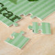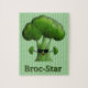 Funny grüner Broccoli mit dunklen Tönen und einem großen frechen Lächeln. Im Folgenden finden Sie die Worte Broc-Star in grünem Text auf grünem, gestreiften Hintergrund.