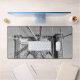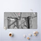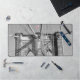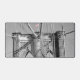 featuring a black and white close-up photo of one of the columns of the Brooklyn Bridge located in New York City adorned with an American flag.