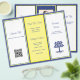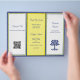 Faltbroschüre in dunkelblau, gelb und weiß. Fügen Sie ein persönliches Foto für den "about" Bereich, einen QR-Code und Logo bei Bedarf hinzu. Das blaue Baumbild auf der Vorderseite kann Ihr Logo werden. Neutrale Farben greifen Aufmerksamkeit auf sich und arbeiten für fast alle Arten von Unternehmen. Anpassen mit Header-Text und kleinerem Druck auf sechs Panels zwischen zwei Seiten von 8x11 Zoll Papier. Eine Änderung der Papiergröße kann das Design verändern, sodass es nicht richtig passt.