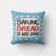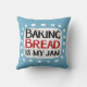 "Baking Bread Is My Jam" ist ein niedliches Textdesign in blau mit schwarzem und rotem Text, zusammen mit einer weißen Akzent-Form und weißen texturierten weißen, weißgetönten weißen Punkten, die ihn umgeben.