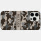 Customize this brown and gray camouflage iPhone 16 pro max case with your name in a trendy modern CAP font in brown on taupe. It's masculine and perfect for your favorite military, hunting, country or outdoorsman!