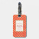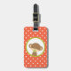 Personalisierter Gepäckanhänger mit einem niedlichen Babyaffe mit einem Schnuller in seinem Mund In einem Oliven-grünen Kreis. Der Hintergrund ist ein orangefarbenes und weißes Polka-Punktmuster.