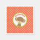 Papierservietten mit einem niedlichen Affen, der einen Schnuller in seinem Mund in einem Kreis mit einer olivgrünen Grenze hält. Das Wort Nomnomnom über seinem Kopf, das mit einem Namen oder anderen Text angepasst werden kann. Der Hintergrund ist ein orangefarbenes und weißes Polka-Punktmuster.