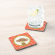 Ein Untersetzer mit einem niedlichen Affen, der einen Schnuller in seinem Mund in einem Kreis mit einer olivgrünen Grenze hält. Der Hintergrund ist ein orangefarbenes und weißes Polka-Punktmuster.
