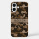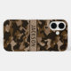 Customize this multi-hued brown camouflage iPhone 16 case with your name in a trendy modern CAP font in dark brown on light brown. It's masculine and perfect for your favorite military, hunting, country or outdoorsman!