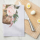 Ein Küchentuch mit niedlichem Design, das in Aquarellen mit einem braunen Hut aus Kuhhhut und einem Strauß rosa Blume auf der Spitze gestaltet wurde.