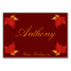 Braune Tischkarten mit Erntedank-Platzkarten mit schönen roten und gelben Herbstlauben auf braunem Hintergrund und anpassbarem Text.