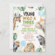 Young, wild and three birthday invitation for boy featuring various jungle animals, party hats, balloons and tropical foliage. Ideal for a boys jungle themed 3rd birthday party.