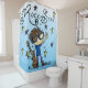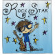Ein niedlicher Duschvorhang für Ihren kleinen Rockstar, mit einem farbenfrohen Hintergrund mit Sternen in Gelb und Dunkelblau, extravaganter Text mit Rock Star und einem braunen, haarigen Jungen mit Gitarre.