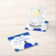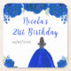 This birthday party coaster features faux glitter royal blue floral flowers and a beautiful princess with brown hair and an elegant dress. This is perfect for a birthday party.