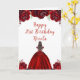 This birthday card features faux glitter red floral flowers and a beautiful princess with brown hair and an elegant dress. This is perfect for a birthday party.