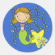 Eine braune haarige Meerjungfrau und gelbe Seesterne schwimmen zwischen den Algen, ein Design, das niedlich und farbenfroh für Mädchen, die Liebe des Ozeans und Meerjungfrauen! Meerjungfrau-T - Shirt, Karosseriebleume, Buben, Decken, Sticker, Taschen, Tasse, Schlüsselketten, Kissen, Wanduhren und viele andere Meerjunggeräte!