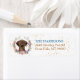 Die links Seite dieser Rücksendeadressen-Aufkleber zeigt einen Blume-Kranz in den Farben Weich Rosa, Blau, Gold, Grün und Creme. In der Mitte befindet sich ein niedliches Aquarellporträt eines Schokoladenhundes. Die winzigen goldenen Konfetti geben dem Hintergrund ein subtiles Funkeln. Ihr eigener Text ist rechts in blau und braun Gold.