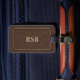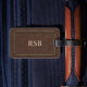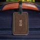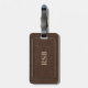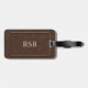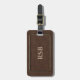 Ein stilvoller Gepäckanhänger in einem braunen ledernen Blick mit dünnem Goldrahmen. Addieren Sie leicht ein Monogramm oder einen Namen.